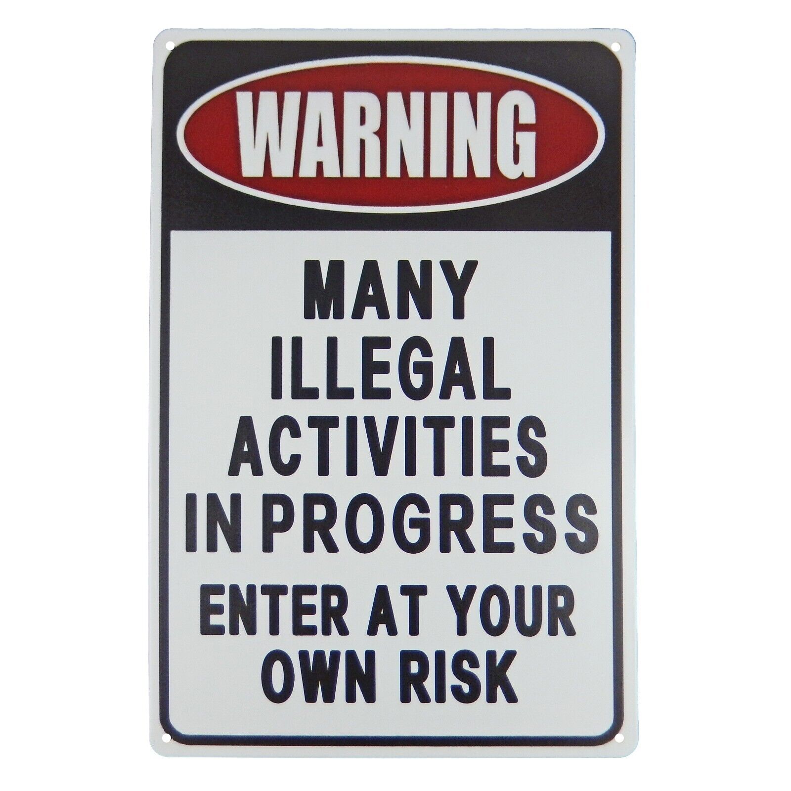 Warning Illegal Activities In Progress Enter At Your Risk Metal Sign 11 3/4 inch