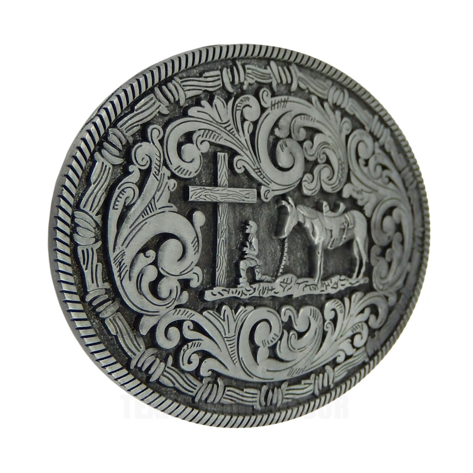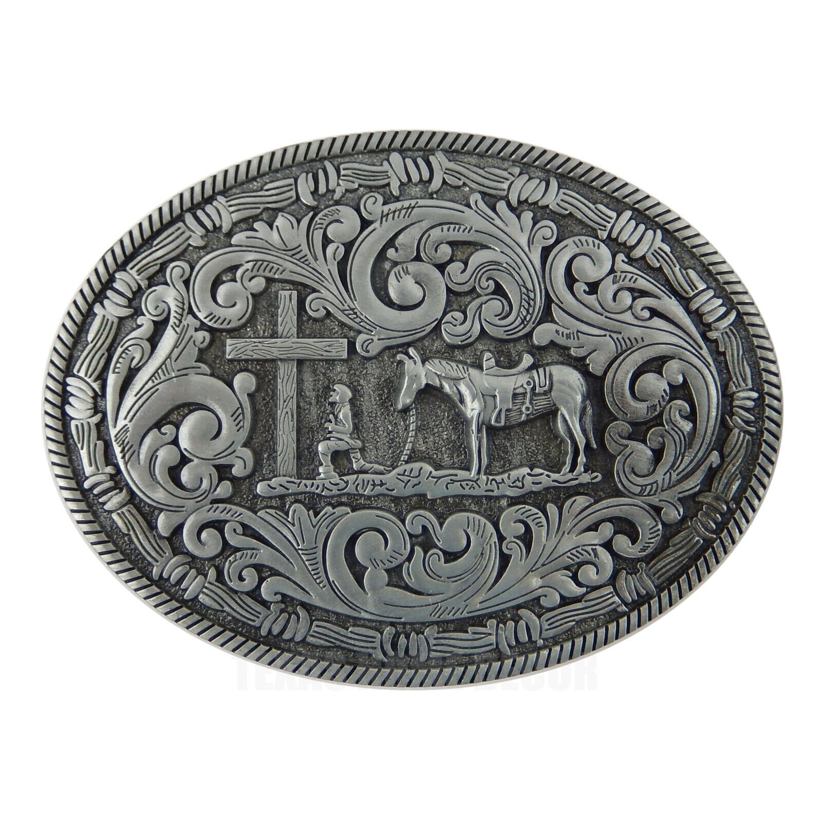 Western Belt Buckle Praying Cowboy Kneeling at Cross Horse Antique Silver Floral
