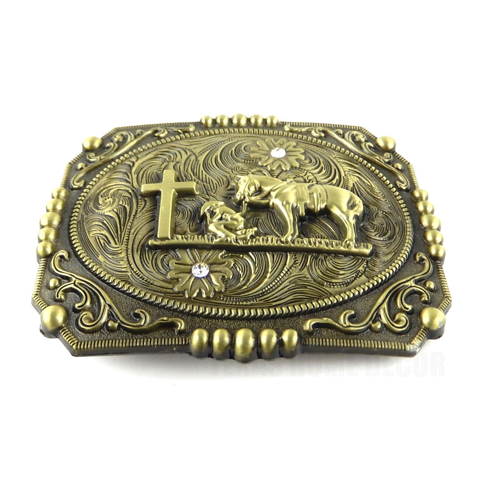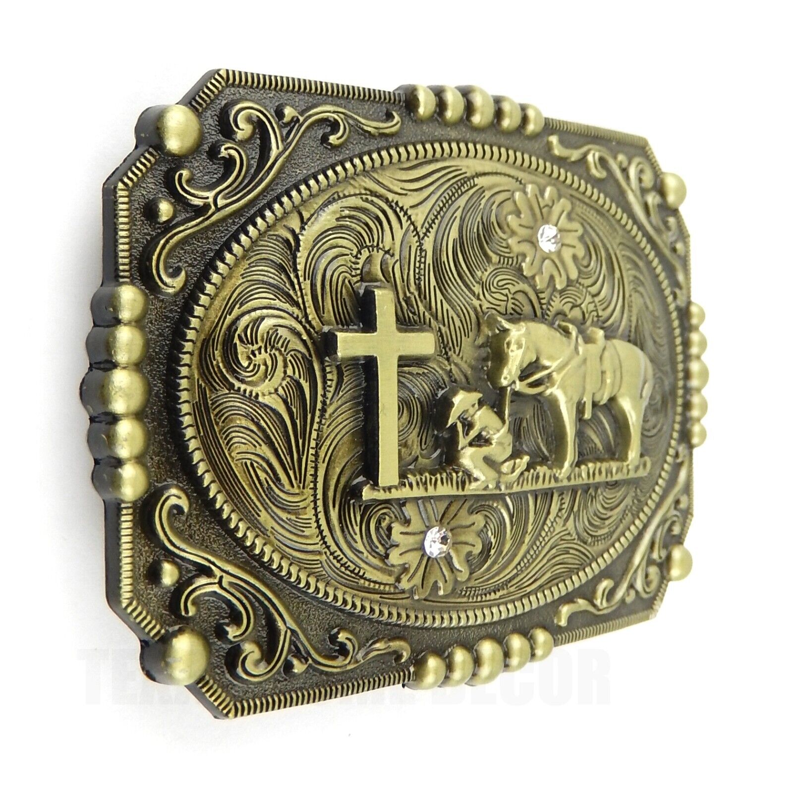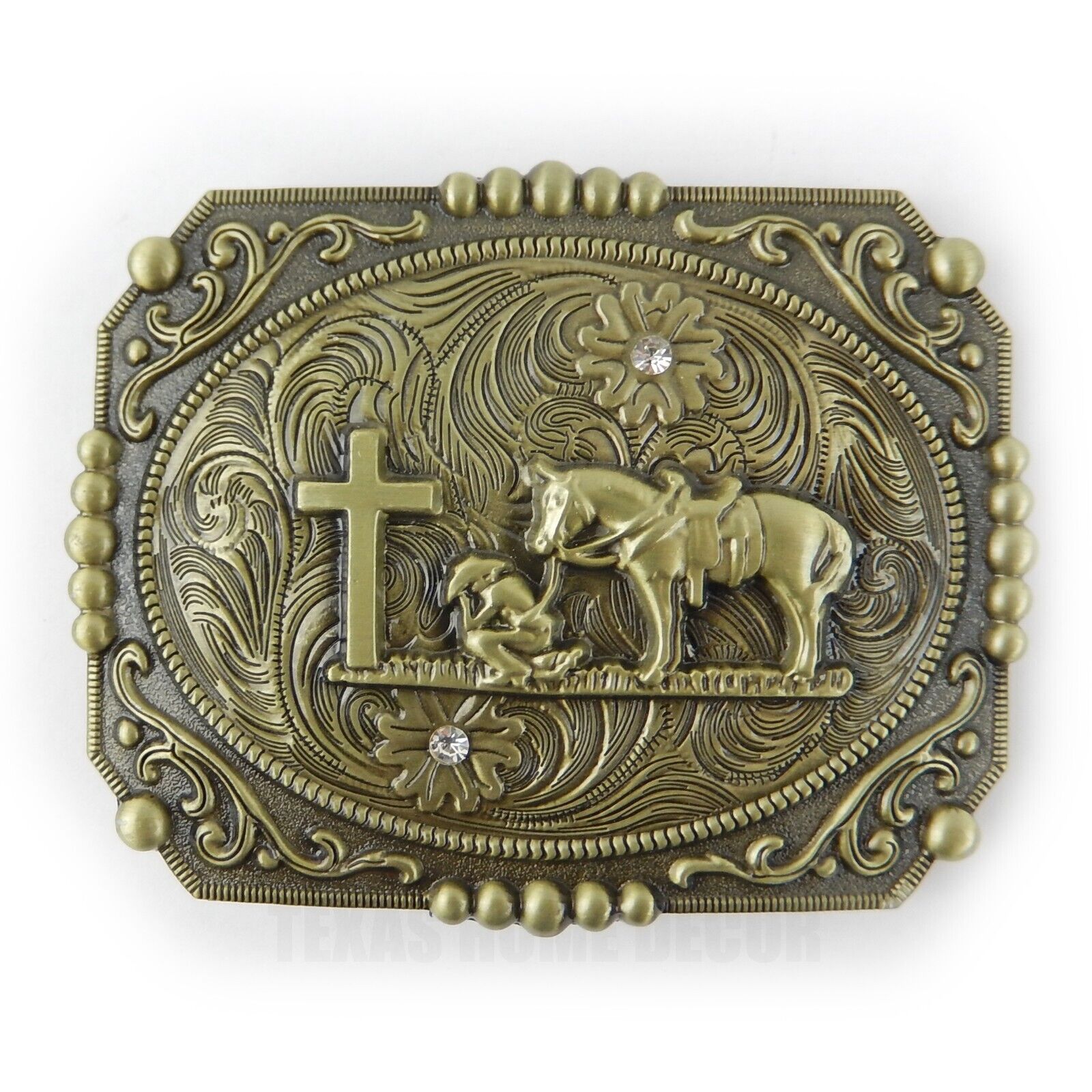 Western Floral Belt Buckle Praying Cowboy Kneeling at Cross Antique Bronze Tone #1790B