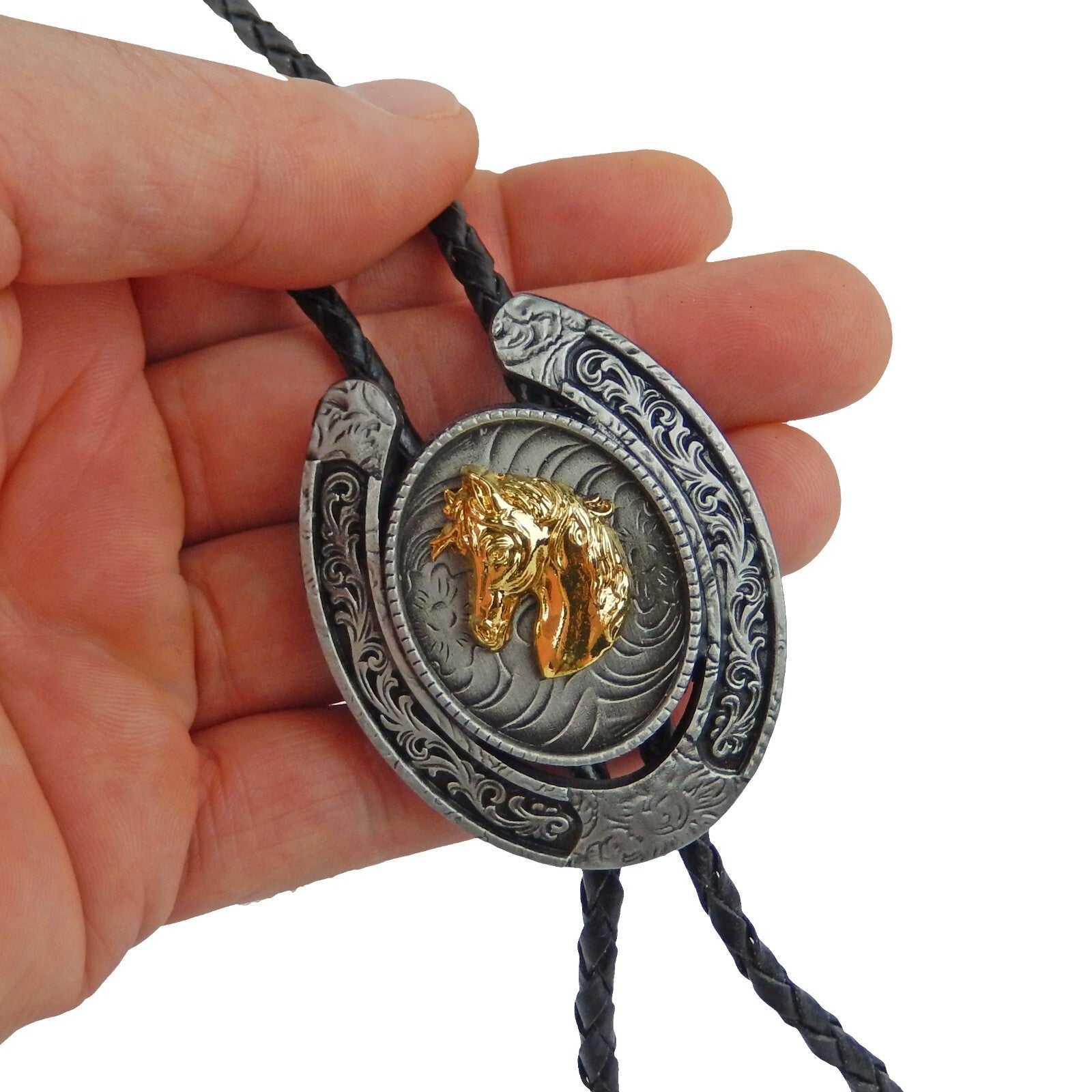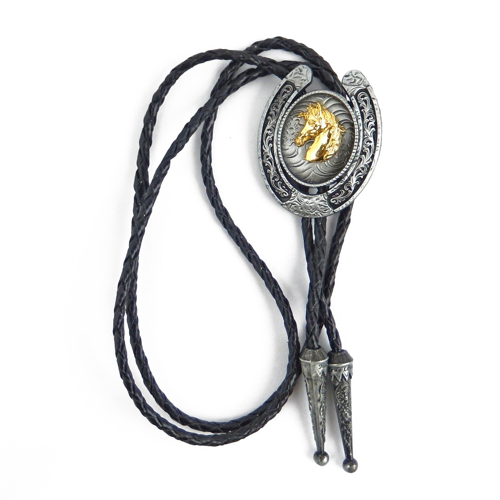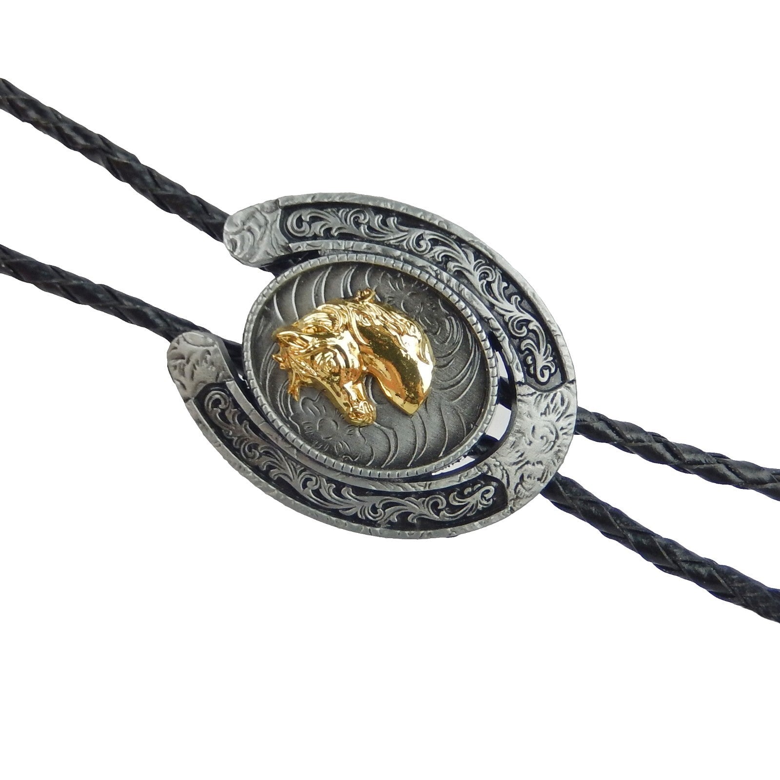 Western Floral Horseshoe Horse Head Bolo Tie 40 inch Black Cord Antique Silver